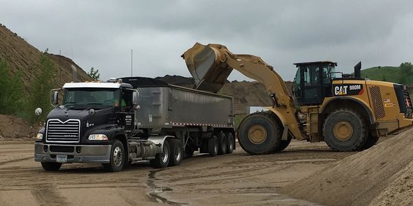 This semi is pulling a frameless East end dump. It is designed for payload. It can haul 26 ton of material. This truck and trailer needs to be straight and extremely level in order to dump safely.